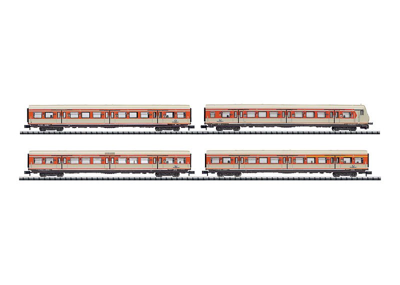 4 verschiedene Schnellzugwagen der DB. 2 Sitzwagen, 1 Aussichtswagen und 1 Speisewagen.