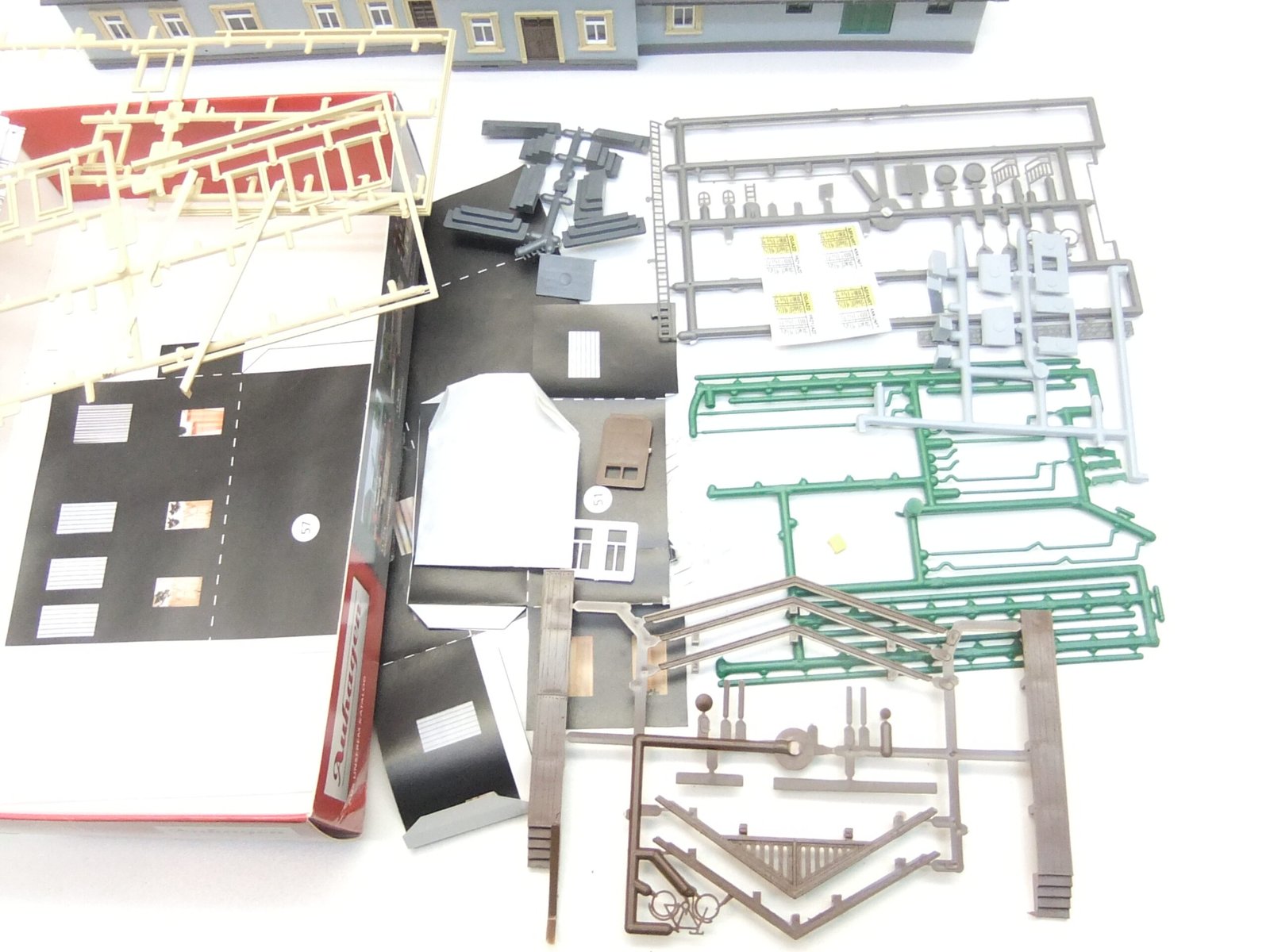 Der Bahnhof ist fast zusammengebaut, recht sorgfältig. Im org.Karton sind noch verschieden Teile, meist an Spritzlingen, vorhanden, Die Bauanleitung liegt ebenfalls bei.