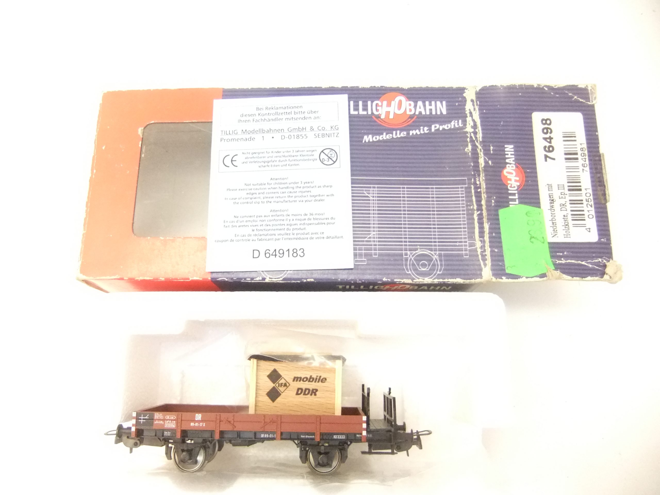 Tillig 76498 HO Niederbordwagen mit Ladegut Holzkiste IFA DR Ep.III
